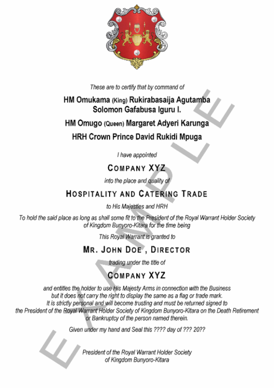 Royal Warrants are a prestigious mark of recognition to those who are regular suppliers of goods and services to the Royal Household of the Kingdom Bunyoro-Kitara. The decision to award Royal Warrants is only made by HM Omukama Rukirabasaija Agutamba Solomon Gafabusa Iguru I., the Head of the Royal House of Bunyoro-Kitara. All the details regarding the use of the Royal Warrant are regulated by separate rules and contracts.