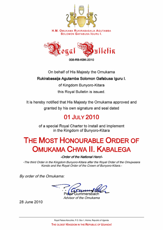 The Most Honourable Order of Omukama Chwa II. Kabalega®